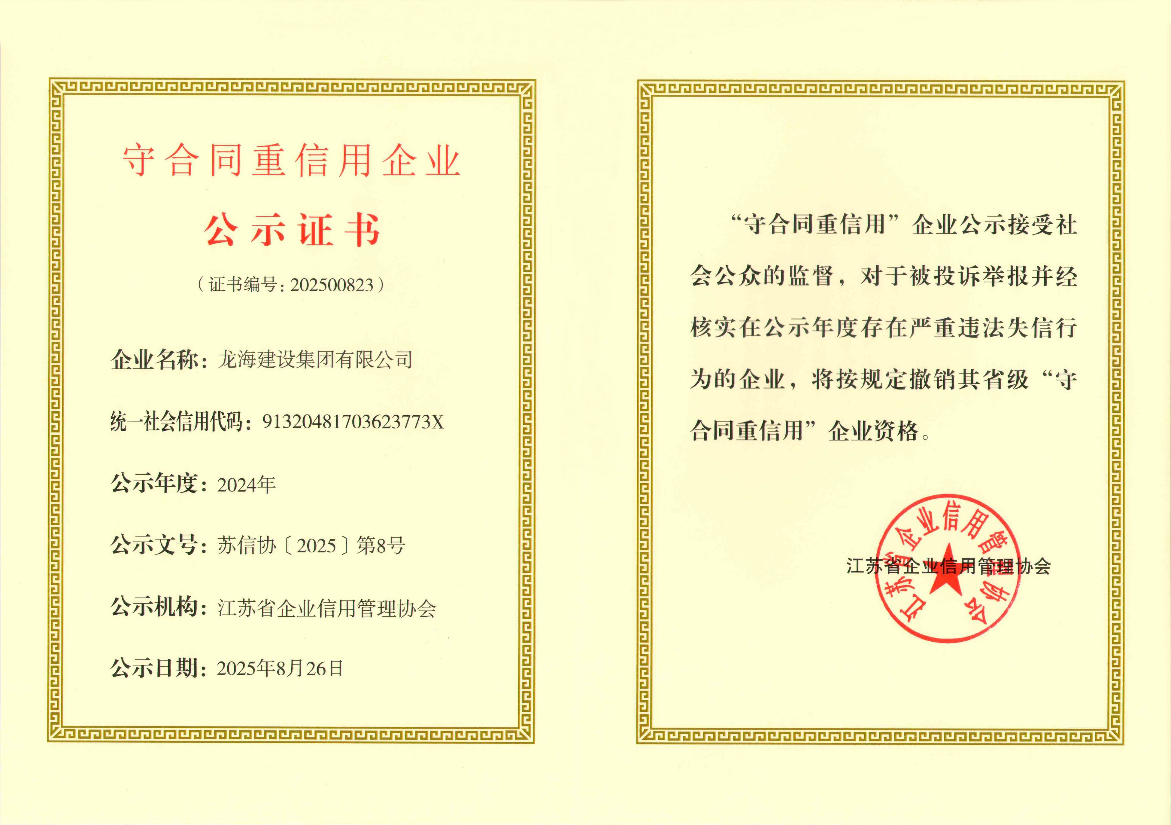 近日,從江蘇省企業(yè)信用管理協(xié)會傳來喜訊,龍海建設集團有限公司憑借在合同管理和信用建設方面的卓越表現(xiàn),成功獲得 “2024年度江蘇省守合同重信用企業(yè)”榮譽稱號。這一榮譽不僅是對龍海建設集團過往努力的高度認可,更是其在建筑行業(yè)持續(xù)穩(wěn)健發(fā)展的有力見證。